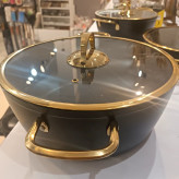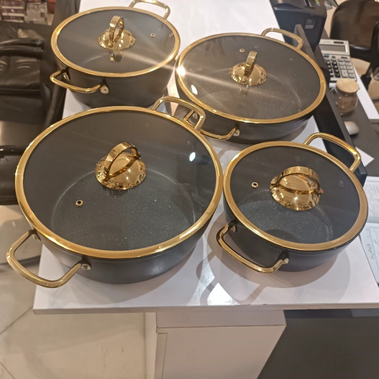 سرویس آلیاژ چدن در دو رنگ مشکی و طوسی درب فلت (تخت) پیرکس لبه ی در ودسته قابلمه طلایی و نقرهای با 5سال ضمانت